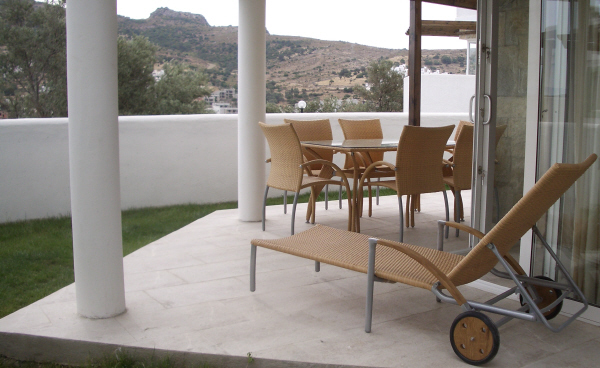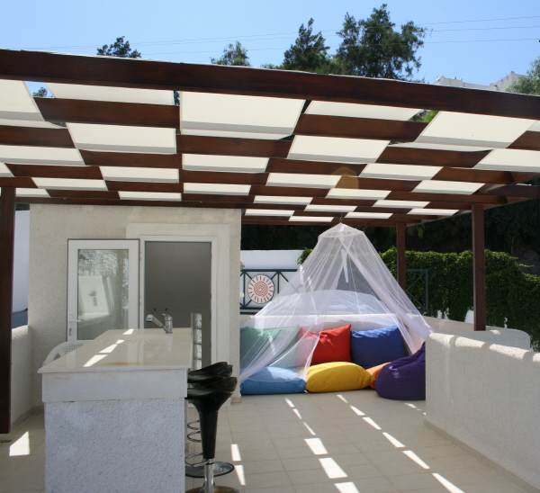 The stairs continue up to the roof terrace which offers a fabulous view of the sea, the beach and whole Kucukbuk bay area. The terrace is partly sheltered and well-furnished with tables and chairs, sun loungers and soft cushions. Bar stools align a work surface with sink and bar area.Outside