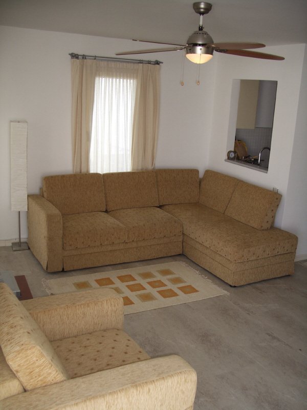 The lounge opens out onto a patio by means of large corner sliding doors and offers a fabulous view of the bay of Kucukbuk. The area can be cooled by means of a ceiling fan or a second outside door which allows a breeze to flow through. A dining table in the lounge seats 6 and can be extended further if necessary. Another 6 seater dining table on the patio makes outdoor eating an easy option. The lounge also sports a sofa-bed corner unit which can sleep a further 2 guests if necessary. The TV receives wide variety of channels via satellite, and has a DVD player. A separate kitchen serves the lounge by means of a serving hatch and contains an oven with hob, large fridge/freezer, toaster, kettle and a full set of crockery, cutlery and essential utensils. The ground floor also features a twin bedroom, separate toilet and washing machine.First Floor
