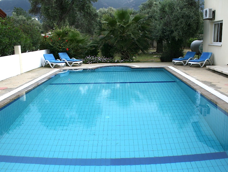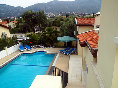 This is a well equipped modern villa with stunning mountain views. It is in a quiet location on a no-through road, only 10 minutes from Kyrenia town centre and harbour. Sunshine Villa offers stunning views of mountains and Bellapais Abbey, and also a view of the sea which is only 5 minutes away. It has a large private overflow swimming pool with Roman steps, and olive groves to front and rear. There is also a roof terrace providing beautiful views of the surrounding mountains and sea, and which also has a large built in barbecue. Sunshine Villa is a bungalow-style house with no internal stairs and so is wheelchair friendly and suitable for disabled persons. There is off road parking on a drive with a ramp for wheelchairs. A large private garden is well screened by exotic trees and plants, providing privacy, set in approximately half an acre. The garden is full of mature fruit trees and exotic flowers, including fig, olive, plum, mullberry, orange and lemon. Guests are welcome to pick and eat the fruit which are all organic. Distances: nearest restaurant and bar is a 2 minute walk, nearest beach is a 20 minute walk, nearest supermarket is 10 minute walk.