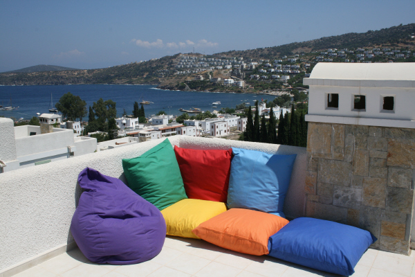 The stairs continue up to the roof terrace which offers a fabulous view of the sea, the beach and whole Kucukbuk bay area. The terrace is partly sheltered and well-furnished with tables and chairs, sun loungers and soft cushions. Bar stools align a work surface with sink and bar area.Outside