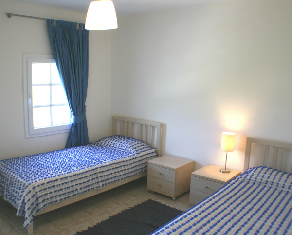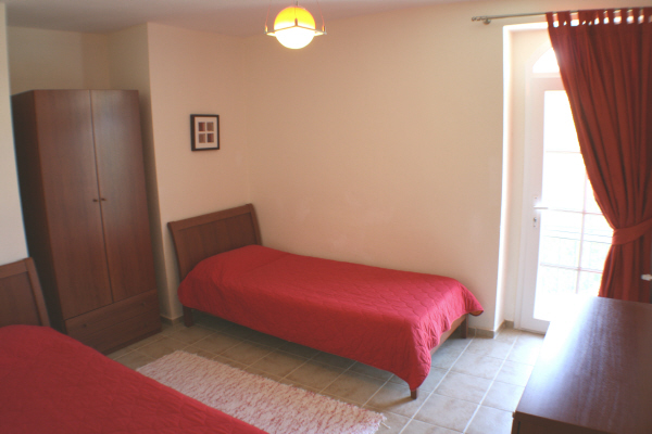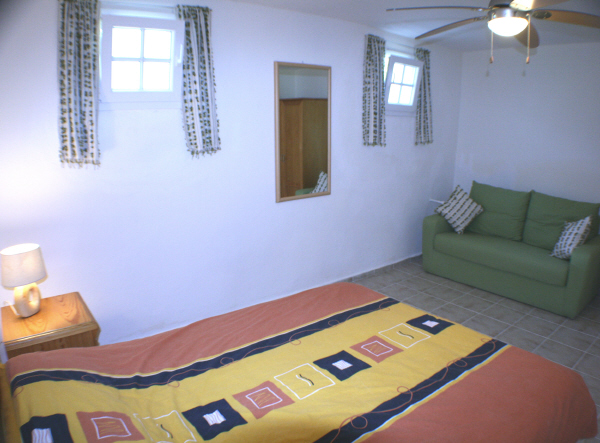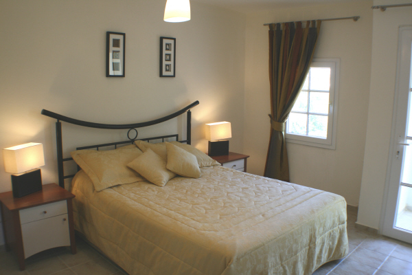 Stairs lead down to a "family room" or up to the 3 first floor bedrooms. The downstairs bedroom features a double bed and a sofa. The room is cooled by a ceiling fan and has a wardrobe and bedside tables. The three first floor bedrooms each have have air conditioning, a wardrobe and drawers. The master bedroom has a double bed whereas the other two are twin bedrooms. The rooms are served by a large bathroom which has a bath with shower, toilet and long mirrored wash area. There is also a washing machine. Stairs lead up to a large rooftop sun terrace which offers magnificent views of the local countryside and sea.Outside