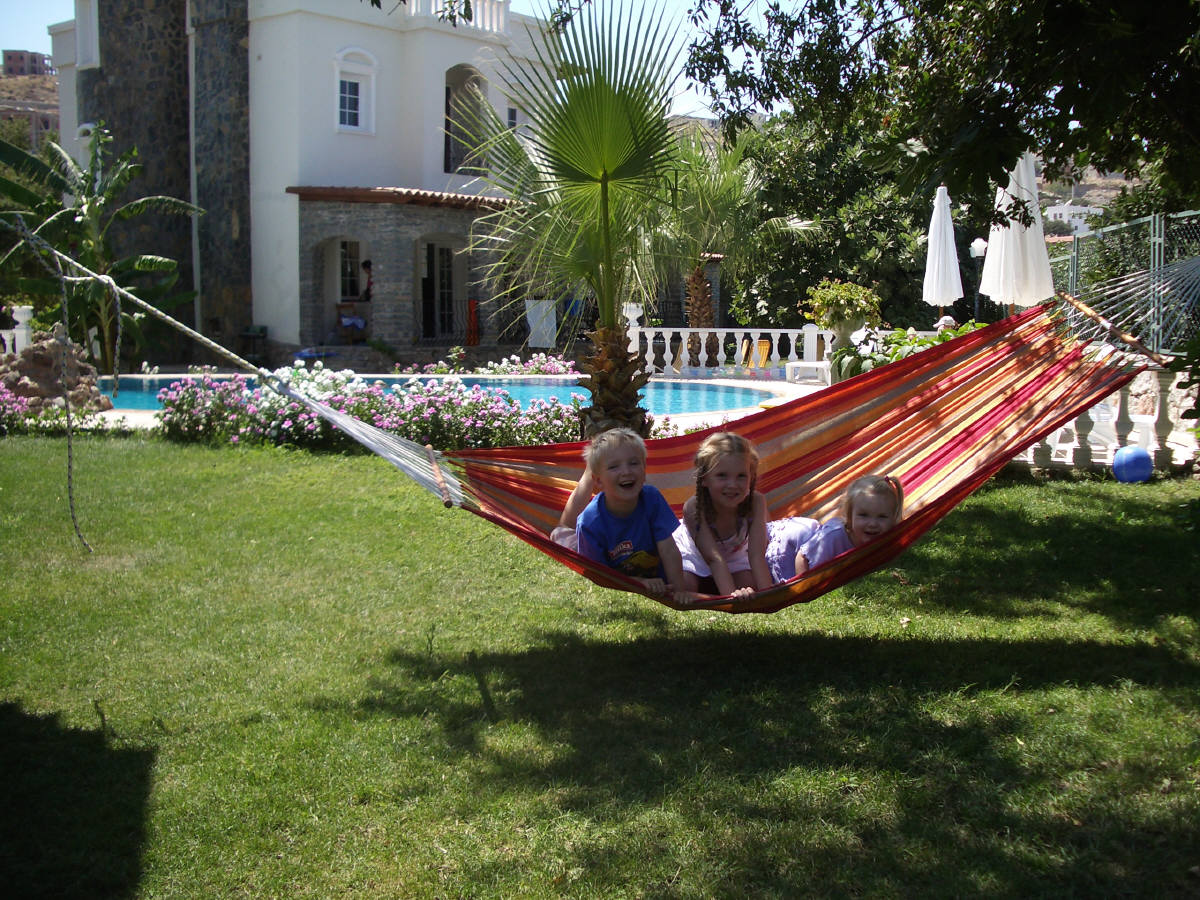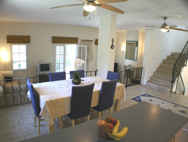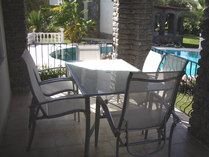 Outside, the covered terrace is furnished with a dining table and chairs to seat up to 8 people - perfect for outside dining. The villa is part of a site of only 6 houses which share the pool and gardens, ours occupying a prime position overlooking the pool. The garden is generously spacious with plenty of lawn space and many beautiful flowers and trees. The whole grounds are maintained to a very high standard by the site manager who lives on the site and will be happy to help with any matters. The villa is located just a five minute walk from a sandy beach and restaurants.